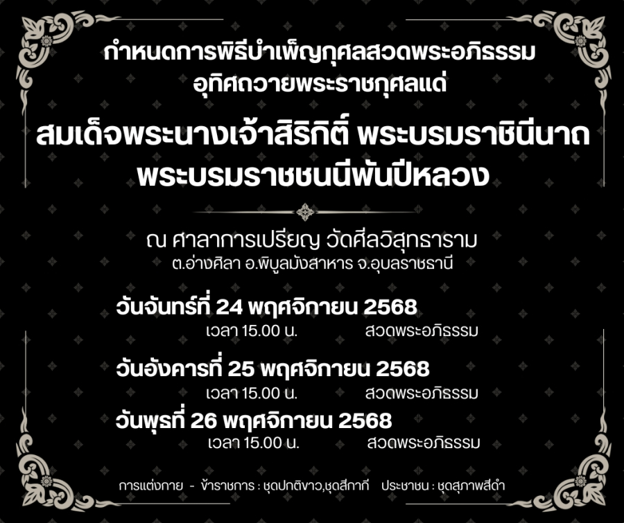 วันพุธ, 19 พฤศจิกายน 2568 12:58✨️?ขอเชิญร่วมพิธีบำเพ็ญกุศลสวดพระอภิธรรม อุทิศถวายพระราชกุศลแด่ สมเด็จพระนางเจ้าสิริกิติ์ พระบรมราชินีนาถ พระบรมราชชนนีพันปีหลวง ระหว่างวันที่ 24-26 พฤศจิกายน พ.ศ.2568 เวลา 15.00 น. เป็นต้นไป ณ ศาลาการเปรียญ วัดศีลวิสุทธาราม ต.อ่างศิลา อ.พิบูลมังสาหาร จ.อุบลราชธานี เพื่อแสดงความจงรักภักดีและสำนึกในพระมหากรุณาธิคุณหาที่สุดมิได้