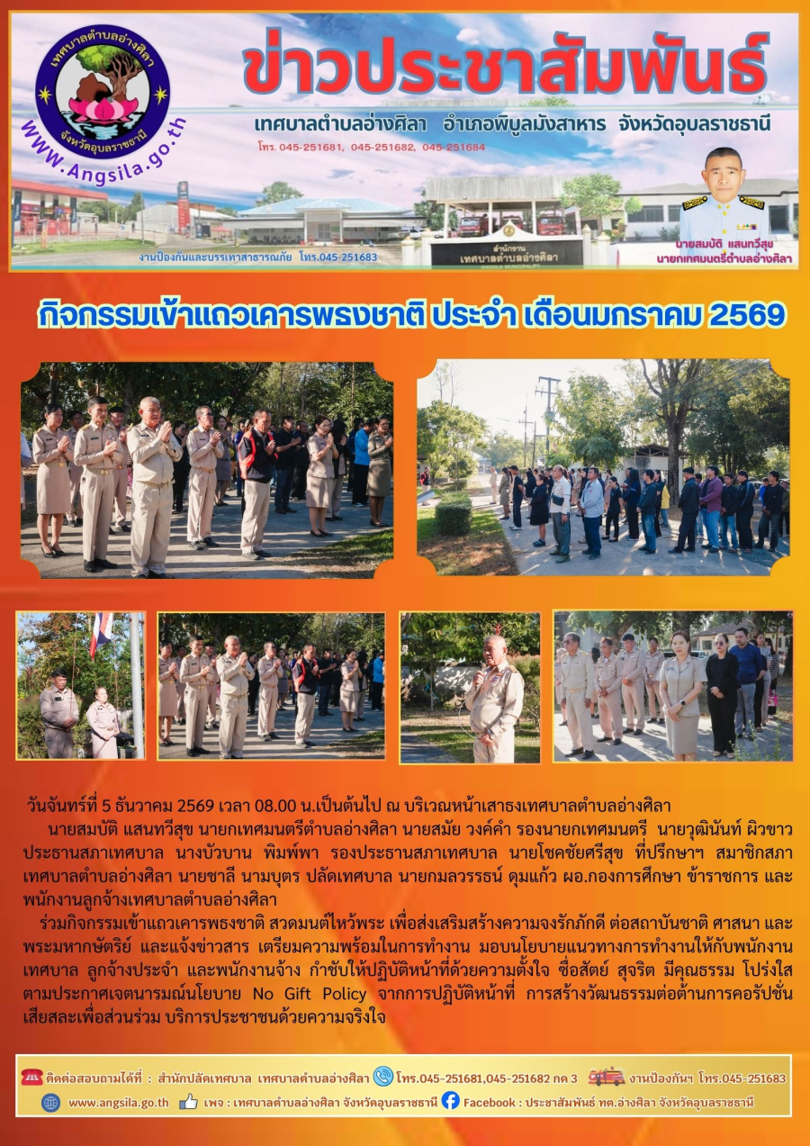 ร่วมกิจกรรมเข้าแถวเคารพธงชาติ สวดมนต์ไหว้พระ เพื่อส่งเสริมสร้างความจงรักภักดี ต่อสถาบันชาติ ศาสนา และ พระมหากษัตริย์ และแจ้งข่าวสาร เตรียมความพร้อมในการทำงาน มอบนโยบายแนวทางการทำงานให้กับพนักงานเทศบาล ลูกจ้างประจำ และพนักงานจ้าง กำชับให้ปฏิบัติหน้าที่ด้วยความตั้งใจ ซื่อสัตย์ สุจริต มีคุณธรรม โปร่งใส ตามประกาศเจตนารมณ์นโยบาย No Gift Policy จากการปฏิบัติหน้าที่ การสร้างวัฒนธรรมต่อต้านการคอรัปชั่น เสียสละเพื่อส่วนร่วม บริการประชาชนด้วยความจริงใจ .‼️