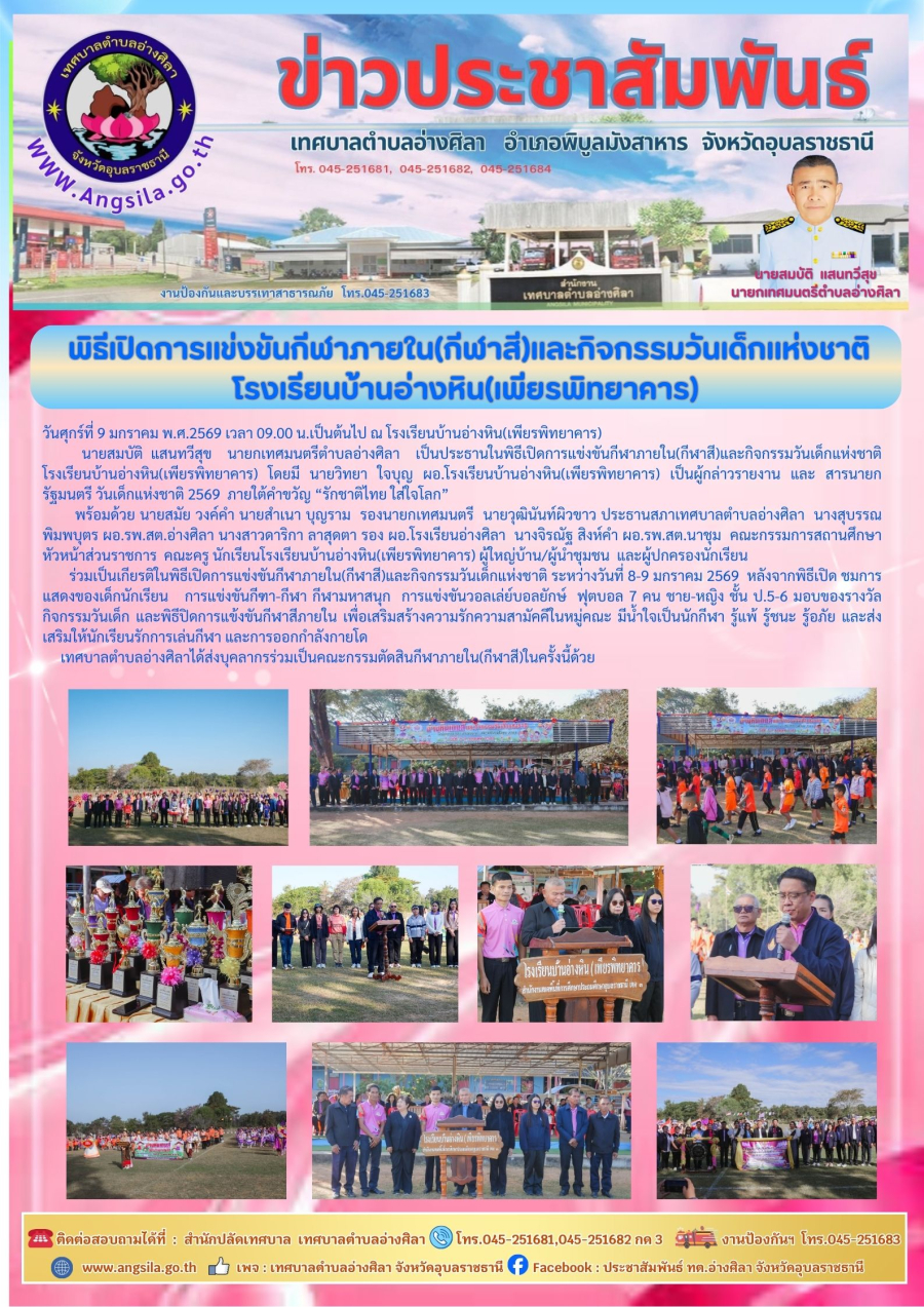 นายสมบัติ แสนทวีสุข นายกเทศมนตรีตำบลอ่างศิลา เป็นประธานในพิธีเปิดการแข่งขันกีฬาภายใน(กีฬาสี)และกิจกรรมวันเด็กแห่งชาติโรงเรียนบ้านอ่างหิน(เพียรพิทยาคาร) โดยมี นายวิทยา ใจบุญ ผอ.โรงเรียนบ้านอ่างหิน(เพียรพิทยาคาร) เป็นผู้กล่าวรายงาน และ สารนายกรัฐมนตรี วันเด็กแห่งชาติ 2569 ภายใต้คำขวัญ “รักชาติไทย ใส่ใจโลก”