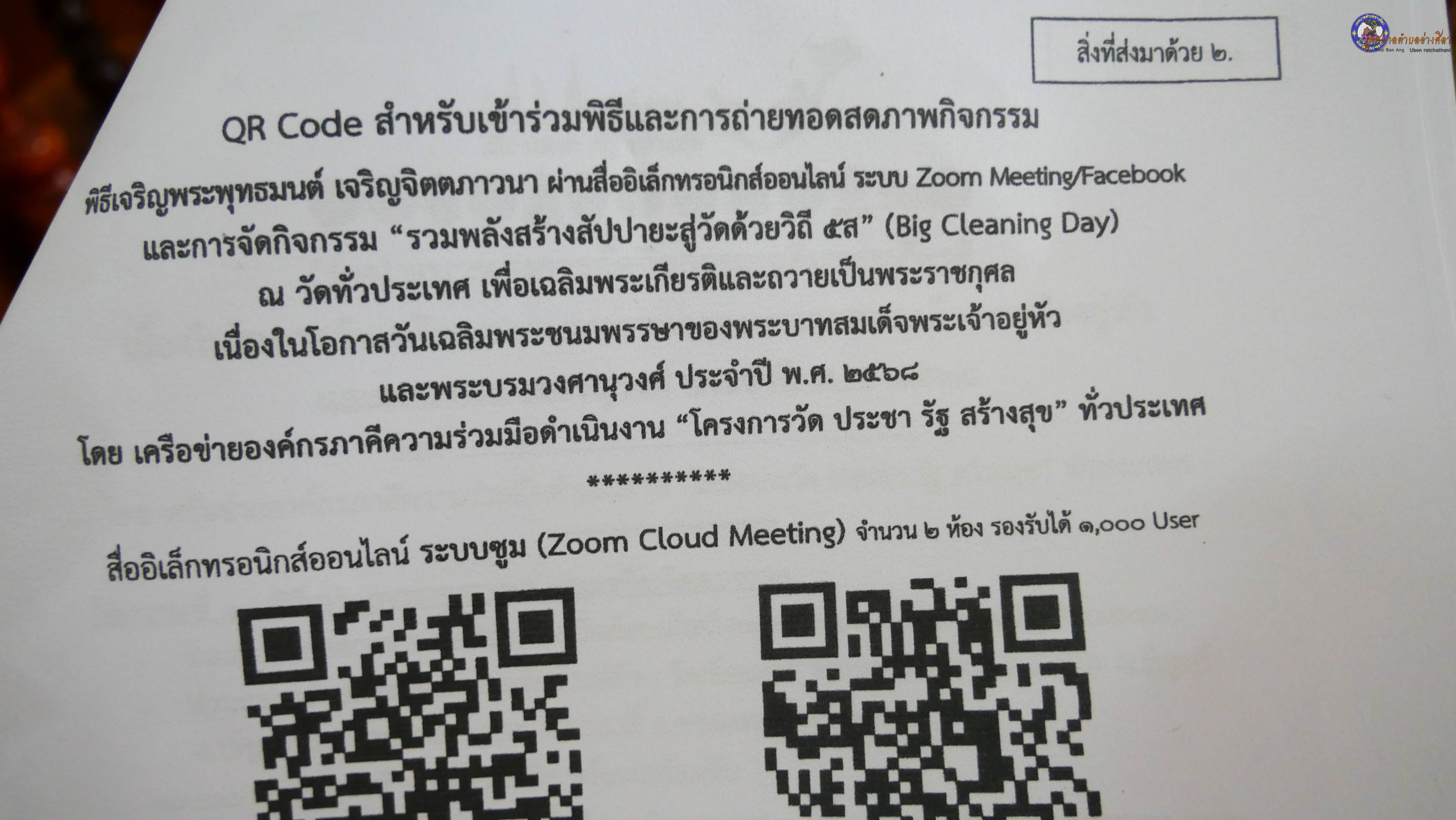 ร่วมพิธีเจริญพระพุทธมนต์ เจริญจิตตภาวนา ผ่านสื่ออิเล็กทรอนิกส์ออนไลน์ ผ่านระบบ Zoom Meeting/Facebook และกิจกรรม “รวมพลังสร้างสัปปายะสู่วัดด้วยวิถี 5ส” (Big Cleaning Day) เพื่อเฉลิมพระเกียรติและถวายเป็นพระราชกุศล เนื่องในโอกาสวันเฉลิมพระชนมพรรษาของพระบาทสมเด็จพระเจ้าอยู่หัว วันเฉลิมพระชนมพรรษาสมเด็จพระนางเจ้าฯพระบรมราชินี และพระบรมวงศานุวงศ์ ประจำปี พ.ศ.2568 โดยเครือข่ายองค์กรภาคีความร่วมมือดำเนินงาน “โครงการวัด ประชา รัฐ สร้างสุข” ทั่วประเทศ