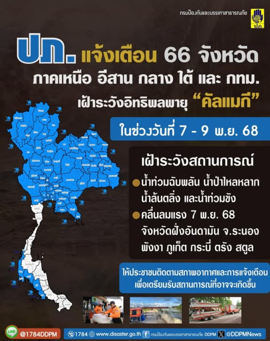 ✨️⚠️ ปภ. แจ้ง 66 จังหวัดทั่วประเทศ เฝ้าระวัง “พายุคัลแมกี” ช่วงวันที่ 7–9 พฤศจิกายน 2568 ⚠️