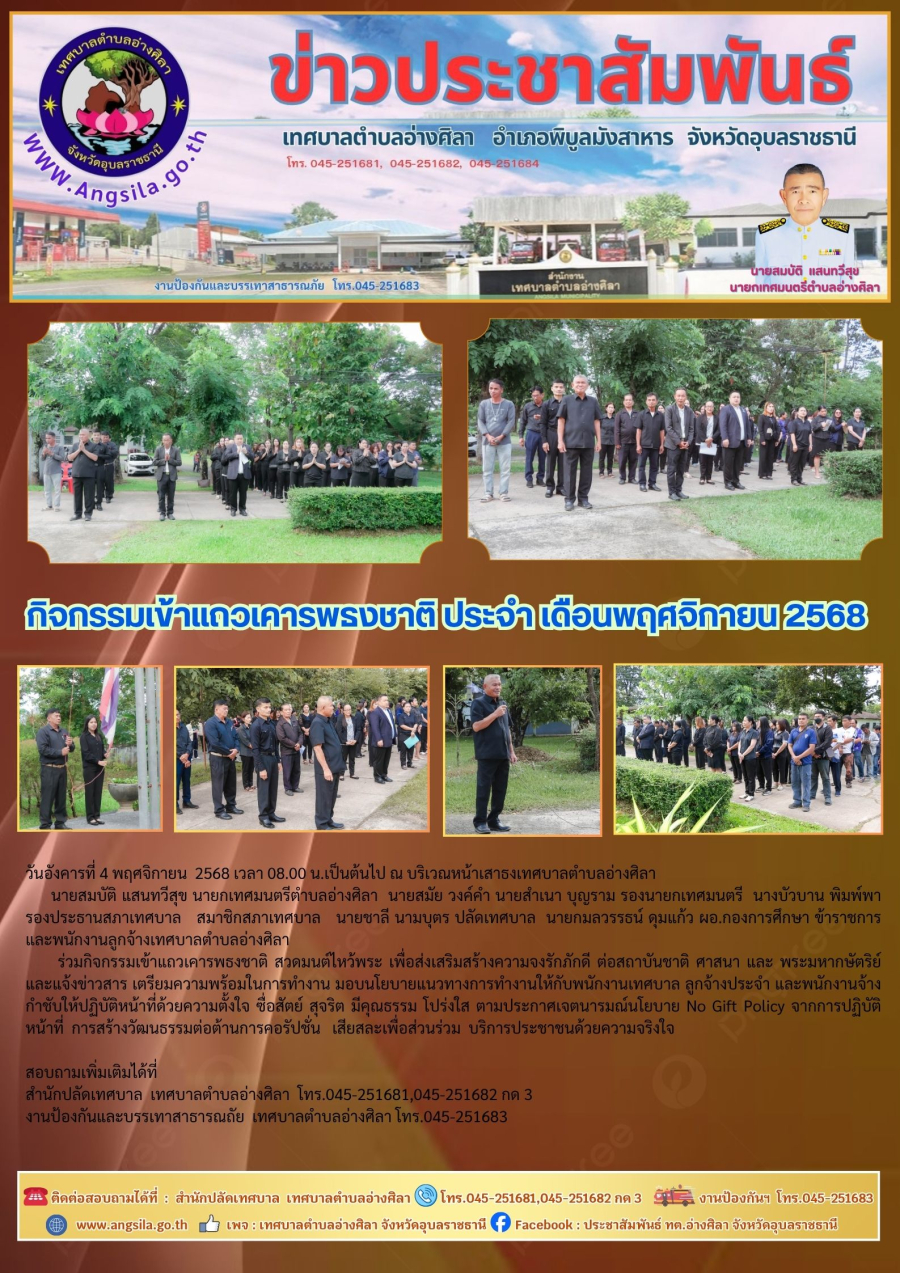 วันอังคารที่ 4 พฤศจิกายน 2568 เวลา 08.00 น.เป็นต้นไป ณ บริเวณหน้าเสาธงเทศบาลตำบลอ่างศิลา