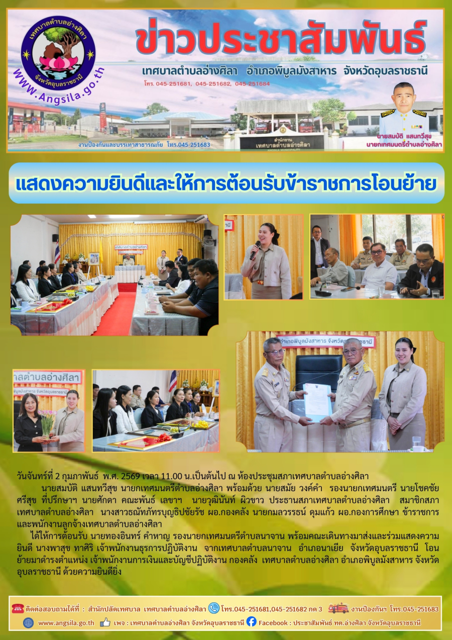ได้ให้การต้อนรับ นายทองอินทร์ คำหาญ รองนายกเทศมนตรีตำบลนาจาน พร้อมคณะเดินทางมาส่งและร่วมแสดงความยินดี นางพาสุข ทาศิริ เจ้าพนักงานธุรการปฏิบัติงาน จากเทศบาลตำบลนาจาน อำเภอนาเยีย จังหวัดอุบลราชธานี โอนย้ายมาดำรงตำแหน่ง เจ้าพนักงานการเงินและบัญชีปฏิบัติงาน กองคลัง เทศบาลตำบลอ่างศิลา อำเภอพิบูลมังสาหาร จังหวัดอุบลราชธานี ด้วยความยินดียิ่ง