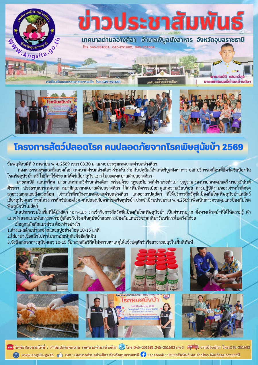 กองสาธารณสุขและสิ่งแวดล้อม เทศบาลตำบลอ่างศิลา ร่วมกับ ร่วมกับปศุสัตว์อำเภอพิบูลมังสาหาร ออกบริการเคลื่อนที่ฉีดวัคซีนป้องกันโรคพิษสุนัขบ้า ฟรี ไม่มีค่าใช้จ่าย แก่สัตว์เลี้ยง สุนัข แมว ในเขตเทศบาลตำบลอ่างศิลา