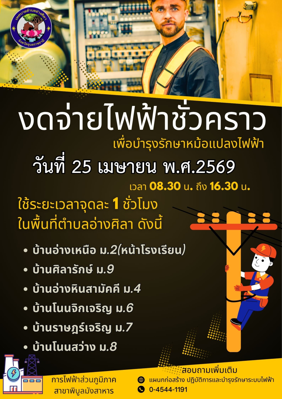 ประชาสัมพันธ์การงดจ่ายไฟฟ้าชั่วคราวเพื่อปรับปรุงระบบจำหน่าย ในวันที่ 25 เมษายน พ.ศ.2569 ระหว่าง เวลา 08.30 -16.30 น. ใช้ระยะเวลาจุดละ 1 ชั่วโมง ในพื้นที่ตำบลอ่างศิลา‼️