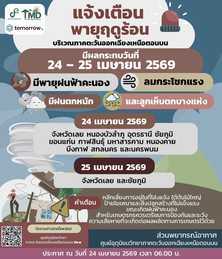 วันศุกร์, 24 เมษายน 2569 09:00✨️รู้แจ้งเตือนพายุฤดูร้อนในภาคตะวันออกเฉียงเหนือตอนบน วันที่ 24 – 25 เมษายน 2569 ⛈️ จะมีพายุฝนฟ้าคะนอง ⚡️ ลมกระโชกแรง และลูกเห็บตกในบางพื้นที่ ?️ โปรดระมัดระวังอันตรายที่อาจเกิดขึ้น ⚠️ ? (มีผลกระทบตั้งแต่วันที่ 24 – 25 เมษายน 2569)