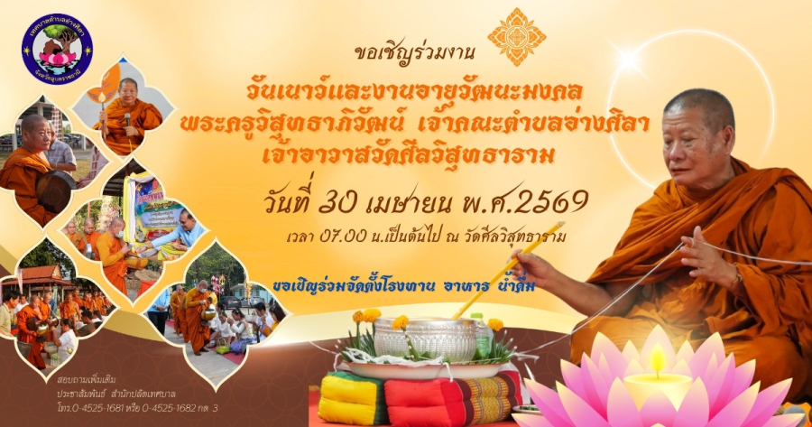 ขอเชิญร่วมงานวันเนาว์และงานอายุวัฒนะมงคล พระครูวิสุทธาภิวัฒน์ เจ้าคณะตำบลอ่างศิลา เจ้าอาวาสวัดศีลวิสุทธาราม ในวันพฤหัสบดีที่ 30 เมษายน พ.ศ.2569 เวลา 07.00 น.เป็นต้นไป ณ วัดศีลวิสุทธาราม ‼️