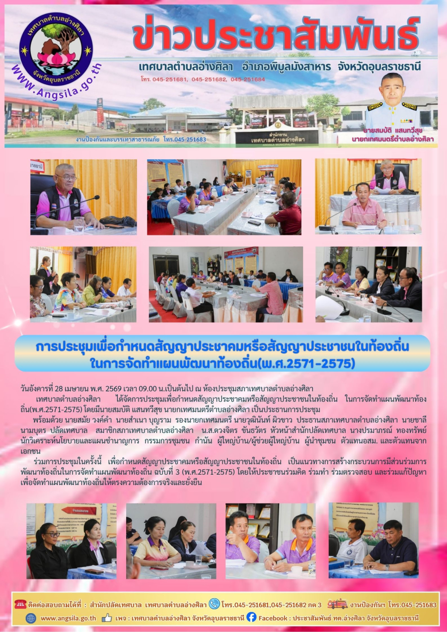 พร้อมด้วย นายสมัย วงค์คำ นายสำเนา บุญราม รองนายกเทศมนตรี นายวุฒินันท์ ผิวขาว ประธานสภาเทศบาลตำบลอ่างศิลา นายชาลี นามบุตร ปลัดเทศบาล สมาชิกสภาเทศบาลตำบลอ่างศิลา น.ส.ดวงจิตร ขันธวัตร หัวหน้าสำนักปลัดเทศบาล นางปรมาภรณ์ ทองทรัพย์ นักวิเคราะห์นโยบายและแผนชำนาญการ กรรมการชุมชน กำนัน ผู้ใหญ่บ้าน/ผู้ช่วยผู้ใหญ่บ้าน ผู้นำชุมชน ตัวแทนอสม. และตัวแทนจากเอกชน ร่วมการประชุมในครั้งนี้ เพื่อกำหนดสัญญาประชาคมหรือสัญญาประชาชนในท้องถิ่น เป็นแนวทางการสร้างกระบวนการมีส่วนร่วมการพัฒนาท้องถิ่นในการจัดทำแผนพัฒนาท้องถิ่น ฉบับที่ 3 (พ.ศ.2571-2575) โดยให้ประชาชนร่วมคิด ร่วมทำ ร่วมตรวจสอบ และร่วมแก้ปัญหา เพื่อจัดทำแผนพัฒนาท้องถิ่นให้ตรงความต้องการจริงและยั่งยืน