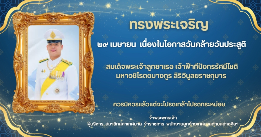 สำนักพระราชวัง ขอเชิญชวนประชาชนร่วมลงนามถวายพระพร สมเด็จพระเจ้าลูกยาเธอ เจ้าฟ้าทีปังกรรัศมีโชติ มหาวชิโรตตมางกูร สิริวิบูลยราชกุมาร เนื่องในโอกาสวันคล้ายวันประสูติ วันที่ ๒๙ เมษายน ๒๕๖๙ ผ่านระบบออนไลน์ ที่เว็บไซต์หน่วยราชการในพระองค์ https://www.royaloffice.th/ ระหว่างวันที่ ๒๘ – ๓๐ เมษายน ๒๕๖๙