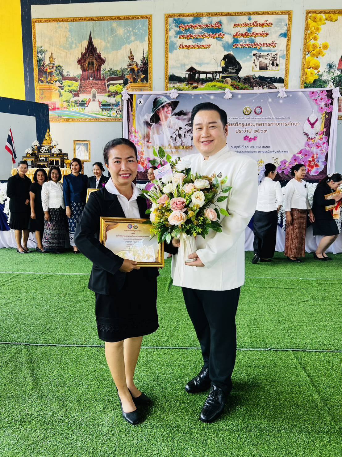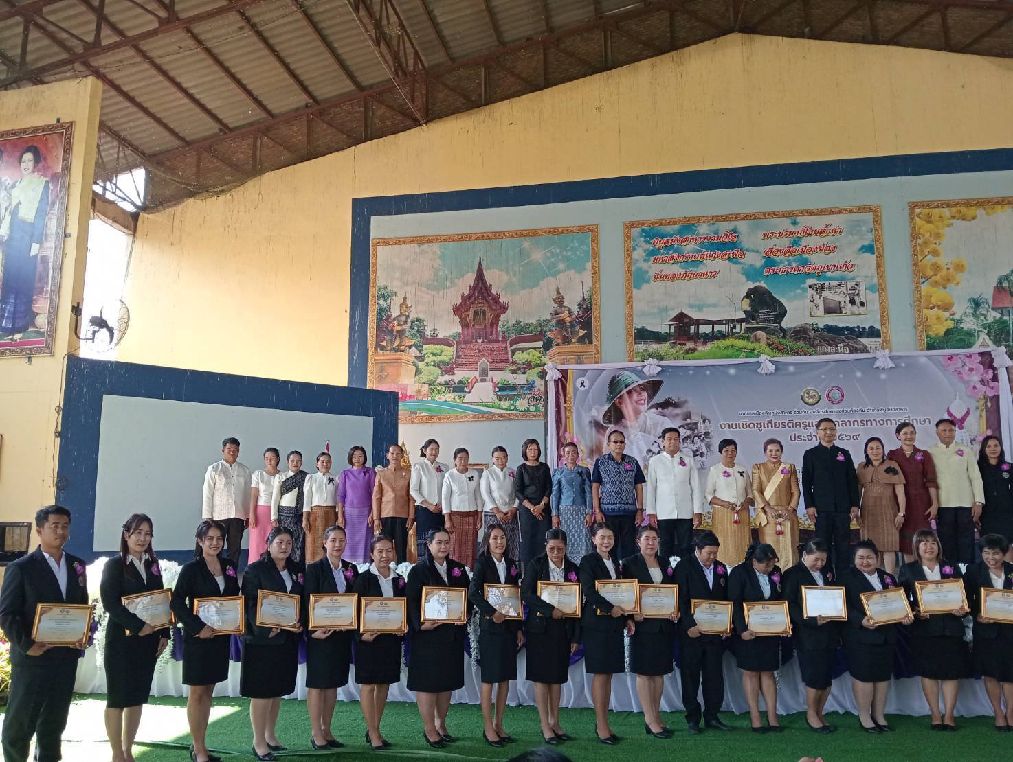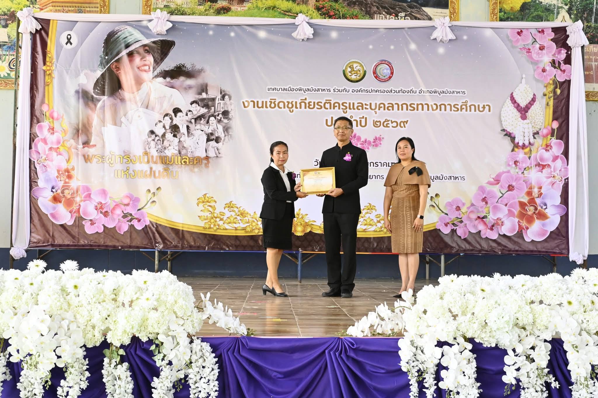 นายสมบัติ. แสนทวีสุข. นายกเทศมนตรีตำบลอ่างศิลา มอบหมายให้ นายกมลวรรธน์ ดุมแก้ว ผอ.กองการศึกษา พร้อม เจ้าหน้าที่กองการศึกษา ครู ศูนย์พัฒนาเด็กเล็กเทศบาลตำบลอ่างศิลา ❤️ร่วมกิจกรรมวันครูประจำปี 2569 ? โดยมี นายภูษิต น้อยโสภากุล รองผู้ว่าราชการจังหวัดอุบลราชธานี เป็นประธานในพิธีและมอบรางวัลครูดีเด่น‼️