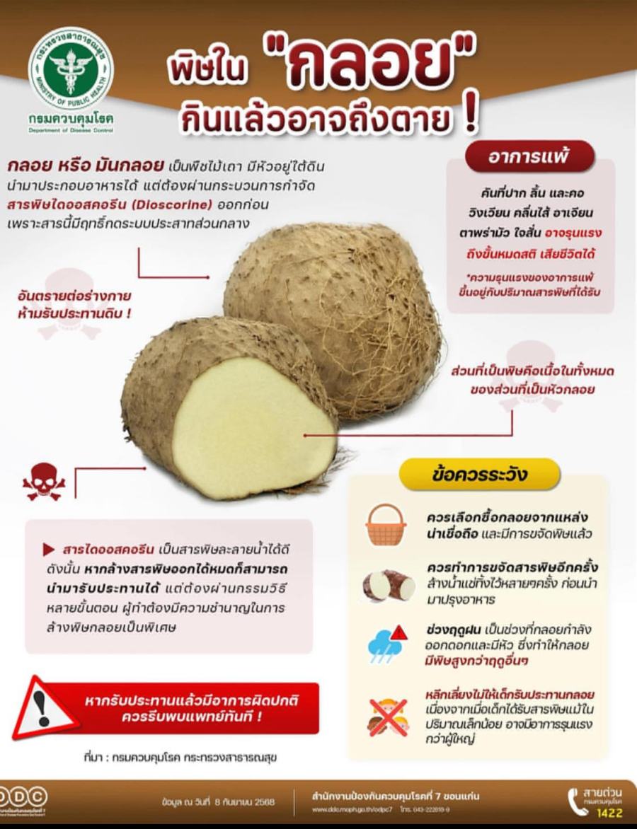 วันอังคาร, 09 กันยายน 2568 11:27✨️‼️ กลอย หรือมันกลอย เป็นพืชไม่เถา มีหัวอยู่ใต้ดิน นำมาประกอบอาหารได้ แต่ต้องผ่านกระบวนการกำจัด สารพิษ (ไดออสคอรีน) (Dioscorine) ออกก่อน เพราะสารนี้มีฤทธิ์กดระบบประสาทส่วนกลาง อันตรายต่อร่างกาย ห้ามรับประทานดิบ!