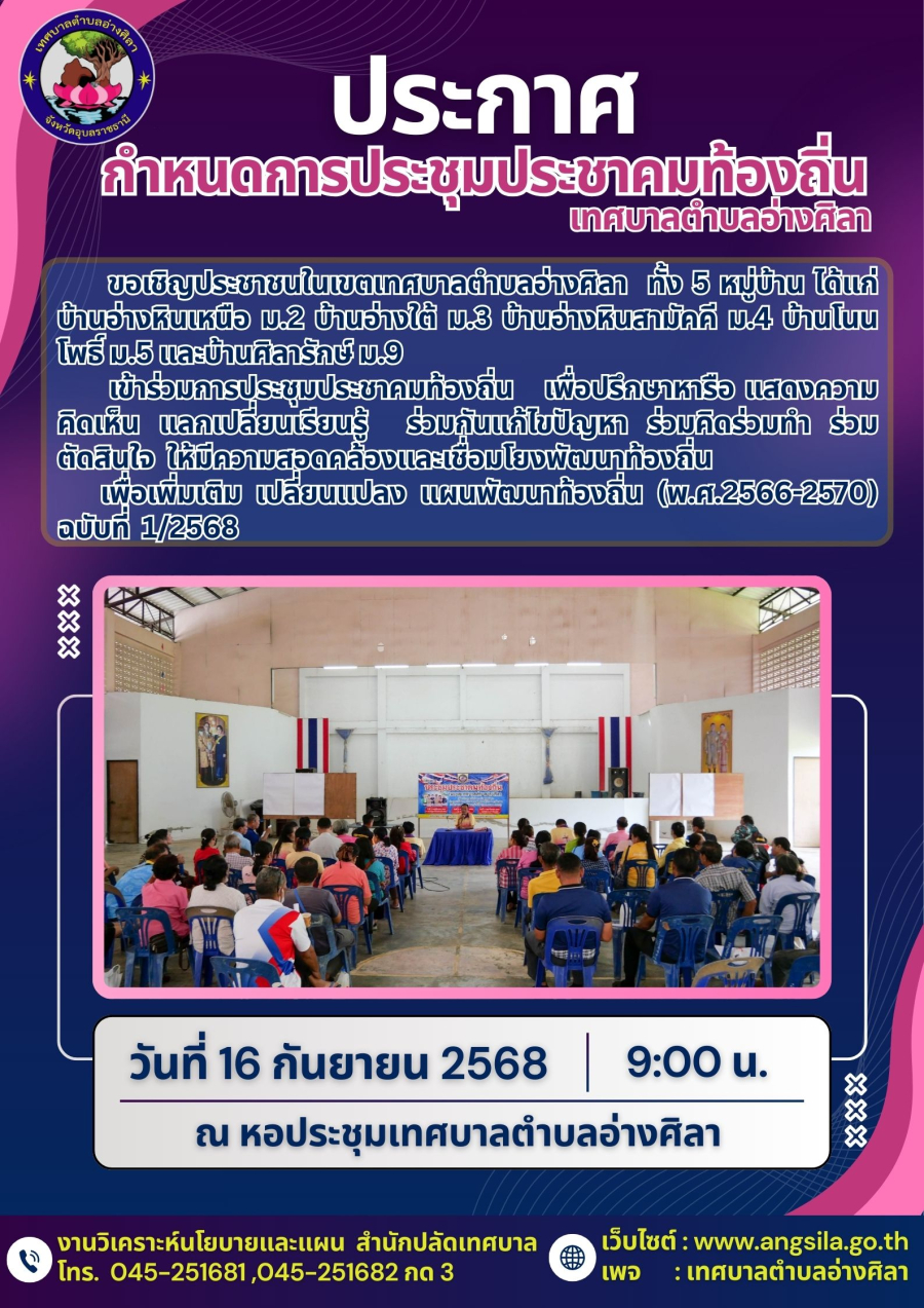 ขอเชิญร่วมการประชุมประชาคมท้องถิ่นในวันที่ 16 กันยายน 2568 เวลา 09.00 น.เป็นต้นไป ณ หอประชุมเทศบาลตำบลอ่างศิลา‼️
