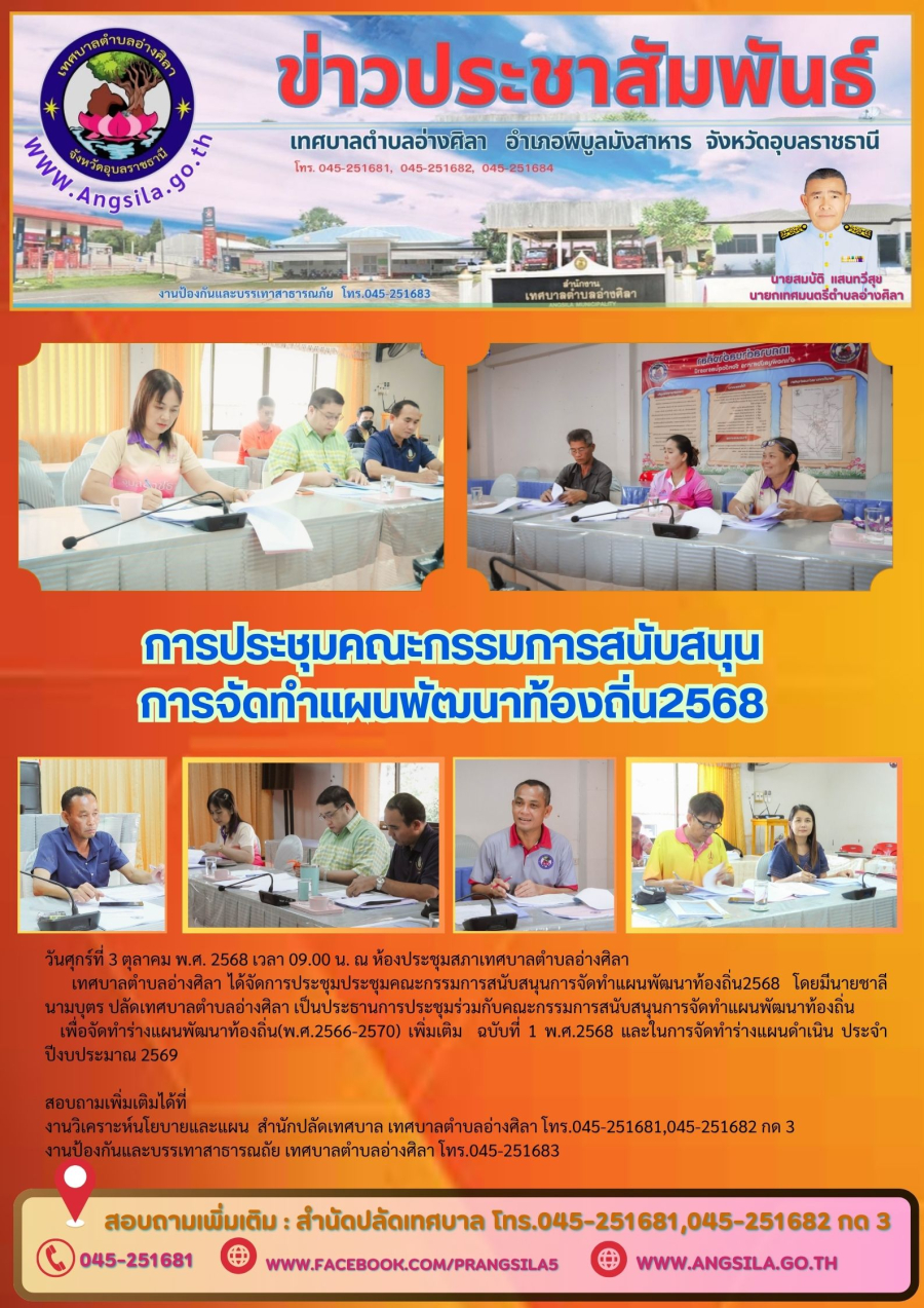 เทศบาลตำบลอ่างศิลา ได้จัดการประชุมประชุมคณะกรรมการสนับสนุนการจัดทำแผนพัฒนาท้องถิ่น2568 โดยมีนายชาลี นามบุตร ปลัดเทศบาลตำบลอ่างศิลา เป็นประธานการประชุมร่วมกับคณะกรรมการสนับสนุนการจัดทำแผนพัฒนาท้องถิ่น