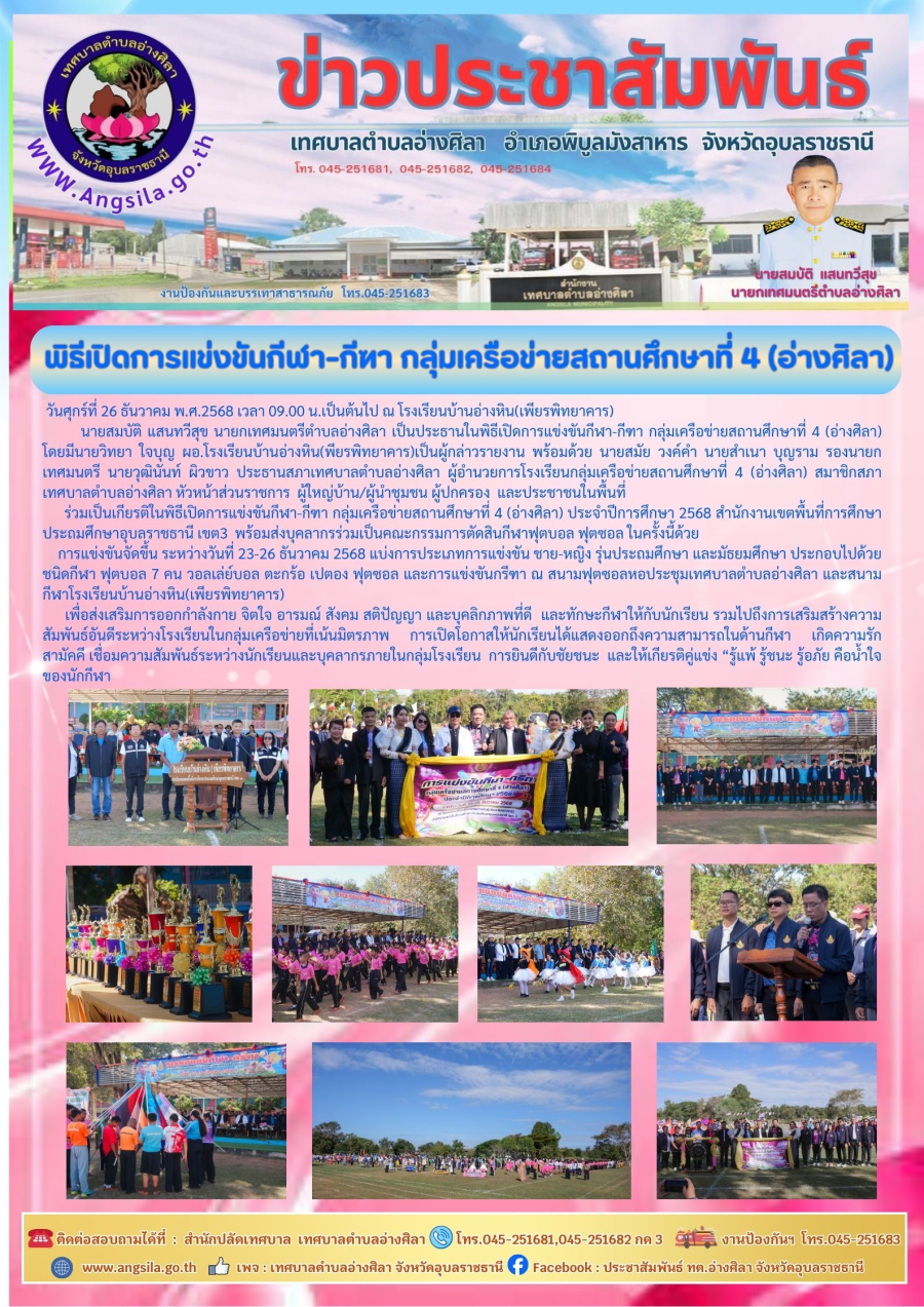 ร่วมเป็นเกียรติในพิธีเปิดการแข่งขันกีฬา-กีฑา กลุ่มเครือข่ายสถานศึกษาที่ 4 (อ่างศิลา) ประจำปีการศึกษา 2568 สำนักงานเขตพื้นที่การศึกษาประถมศึกษาอุบลราชธานี เขต3 พร้อมส่งบุคลากรร่วมเป็นคณะกรรมการตัดสินกีฬาฟุตบอล ฟุตซอล ในครั้งนี้ด้วย ?การแข่งขันจัดขึ้น ระหว่างวันที่ 23-26 ธันวาคม 2568 แบ่งการประเภทการแข่งขัน ชาย-หญิง รุ่นประถมศึกษา และมัธยมศึกษา ประกอบไปด้วยชนิดกีฬา ฟุตบอล 7 คน วอลเล่ย์บอล ตะกร้อ เปตอง ฟุตซอล และการแข่งขันกรีฑา ณ สนามฟุตซอลหอประชุมเทศบาลตำบลอ่างศิลา และสนามกีฬาโรงเรียนบ้านอ่างหิน(เพียรพิทยาคาร)