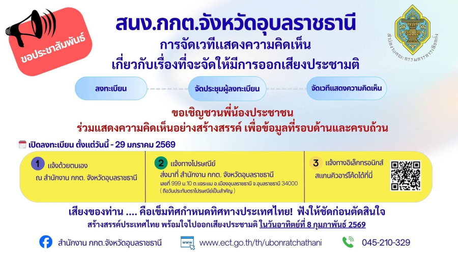 ขอเชิญชวนพี่น้องประชาชนร่วมแสดงความคิดเห็นอย่างสร้างสรรค์เพื่อข้อมูลที่รอบด้านและครบถ้วน  เปิดลงทะเบียนตั้งแต่ วันนี้ถึงวันที่ 29 มกราคม 2569
