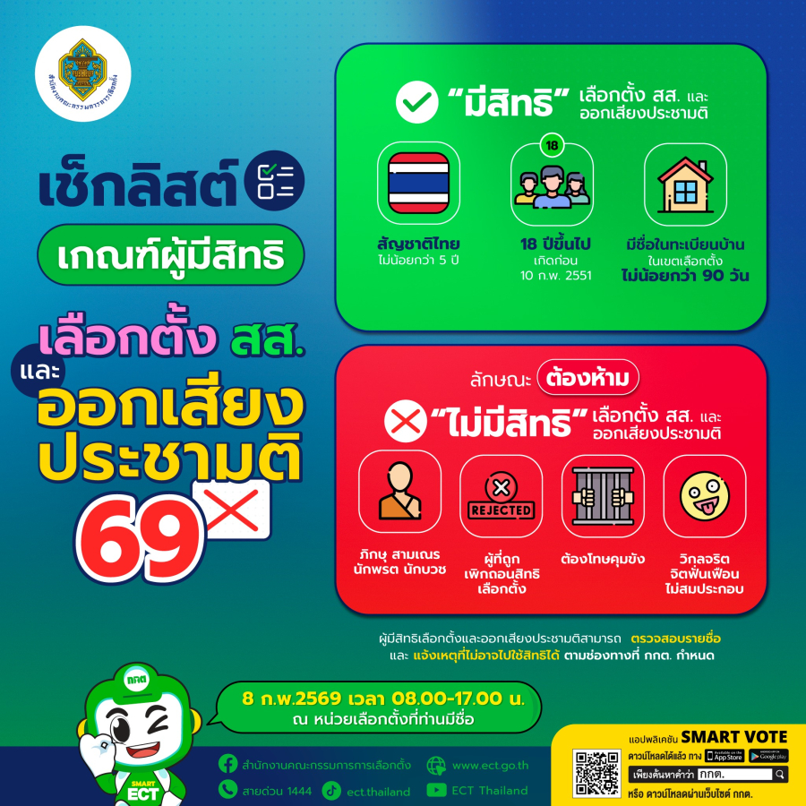 วันที่ 8 กุมภาพันธ์ 2569 ประชาชนชาวไทยจะร่วมกันทำหน้าที่สำคัญของประเทศ ทั้งเลือกตั้งสมาชิกสภาผู้แทนราษฎรและออกเสียงประชามติไปพร้อมกัน