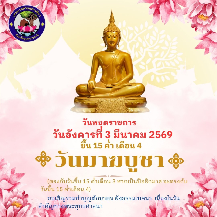 ประชาสัมพันธ์วันหยุดราชการ 1 วัน ‼️ วันมาฆบูชา ตรงกับวันอังคารที่ 3 มีนาคม 2569 ขึ้น 15 ค่ำเดือน 4 (ปีอธิกมาส คือมีเดือนแปดสองครั้ง)