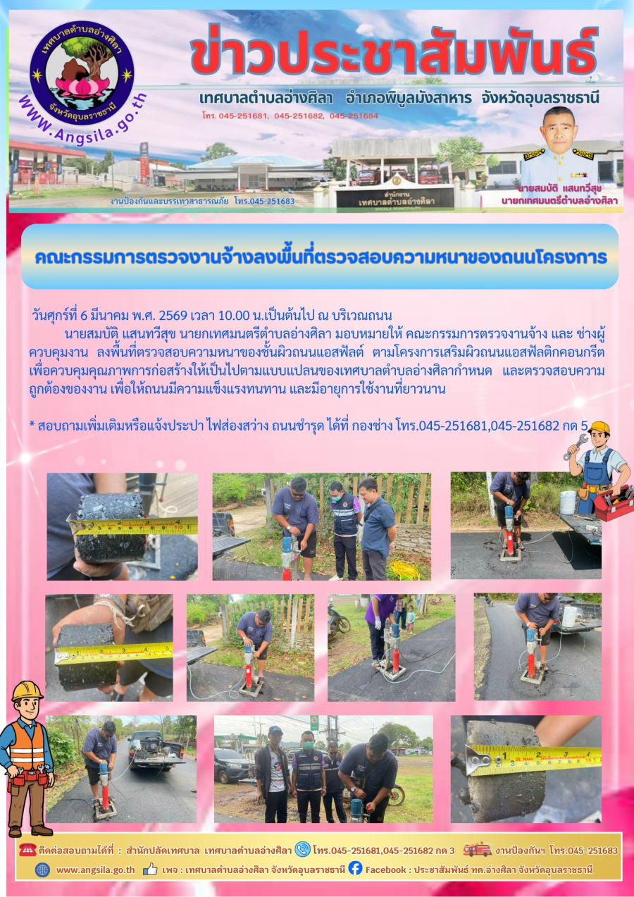 ?ลงพื้นที่ตรวจสอบความหนาของชั้นผิวถนนแอสฟัลต์ ตามโครงการเสริมผิวถนนแอสฟัลติกคอนกรีต เพื่อควบคุมคุณภาพการก่อสร้างให้เป็นไปตามแบบแปลนของเทศบาลตำบลอ่างศิลากำหนด และตรวจสอบความถูกต้องของงาน เพื่อให้ถนนมีความแข็งแรงทนทาน และมีอายุการใช้งานที่ยาวนาน